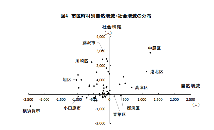 出生数と死亡数から算出した自然増減と、転出者と転入者を比較した社会増減とによる分布ですが、横須賀市は出生数より死亡数が多く、転出者が転入者よりも多く(出ていく人が多い)なっているので大幅に人口が減少しています。