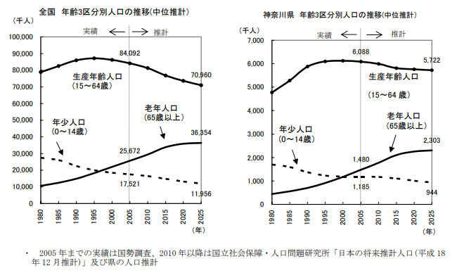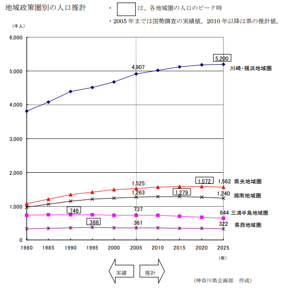 下の図は、神奈川県の2025年までの人口予測ですが、予測では川崎と横浜だけが人口が増加しています。