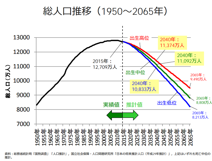 少子化の日本では今後も人口の減少が続き、このままだと2053年頃に1億人を割ると予想されています。