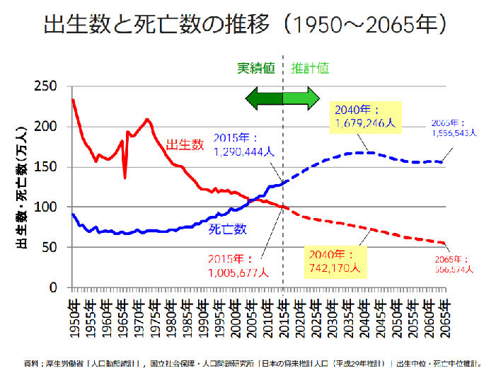 今はまだ死亡数と出生数による人口増減がほとんどなので、この死亡数と出生数のバランスで人口は減少しています。